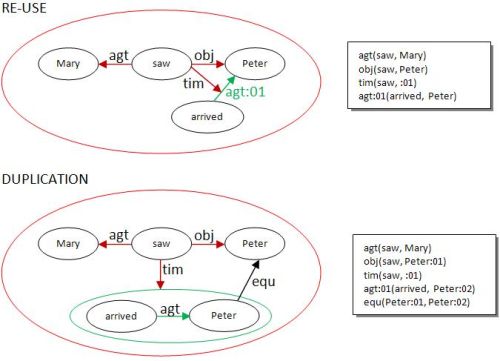 In the first case, the node "Peter" is the argument of two different relations: obj, in the main scope (00); and agt, in the scope 01. This is possible because scopes refer to relations and not to nodes. In the second case, the node "Peter" has been duplicated, and the duplicates have been linked by the relation "equ". Semantically, both representations are possible and equally valid; in the UNL framework, however, we prefer to use the first (re-use) and leave the second for the cases where there can be circularity, such as in: