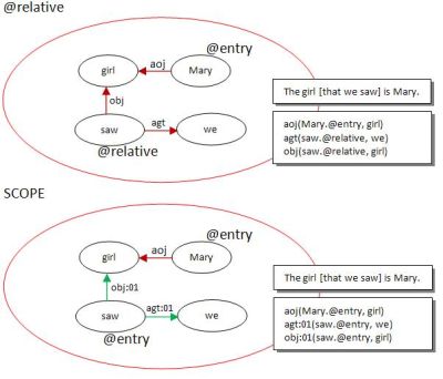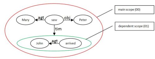 A scope is a group of relations between nodes that work as a single semantic entity in a UNL graph. For instance, in the sentence "Mary saw Peter when John arrived", the dependent clause "when John arrived" describes the argument of a time relation and, therefore, should be represented as a hyper-node (i.e., as a sub-graph) as indicated below:
